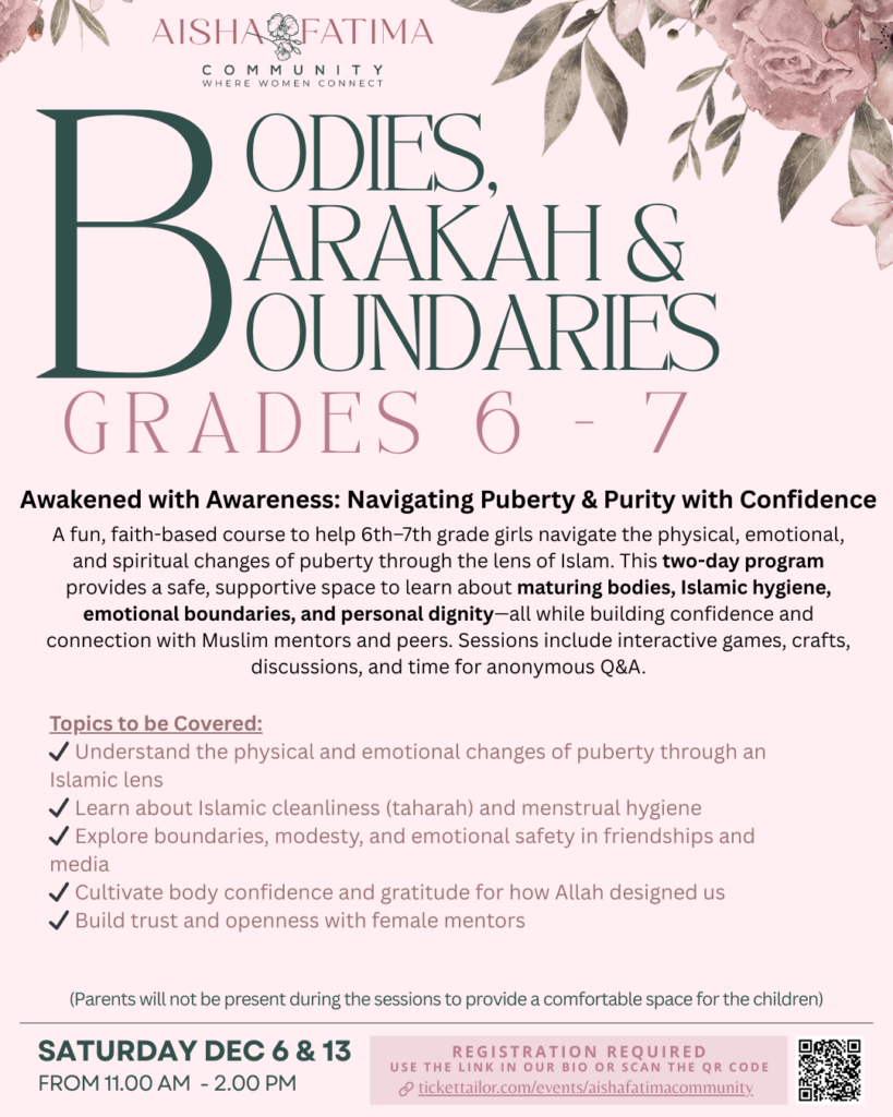 A fun, faith-based course to help 6th–7th grade girls navigate the physical, emotional, and spiritual changes of puberty through the lens of Islam. This two-day program provides a safe, supportive space to learn about maturing bodies, Islamic hygiene, emotional boundaries, and personal dignity—all while building confidence and connection with Muslim mentors and peers. Sessions include interactive games, crafts, discussions, and time for anonymous Q&A.