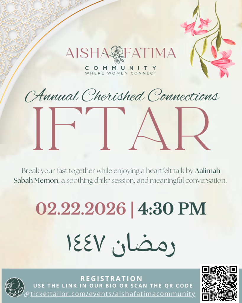 Join us for an evening of warmth, sisterhood, and spiritual connection at our annual Cherished Connections Iftaar—a gathering created for women who wish to break their fast in the company of other women and experience Ramadan in a supportive, uplifting space.
