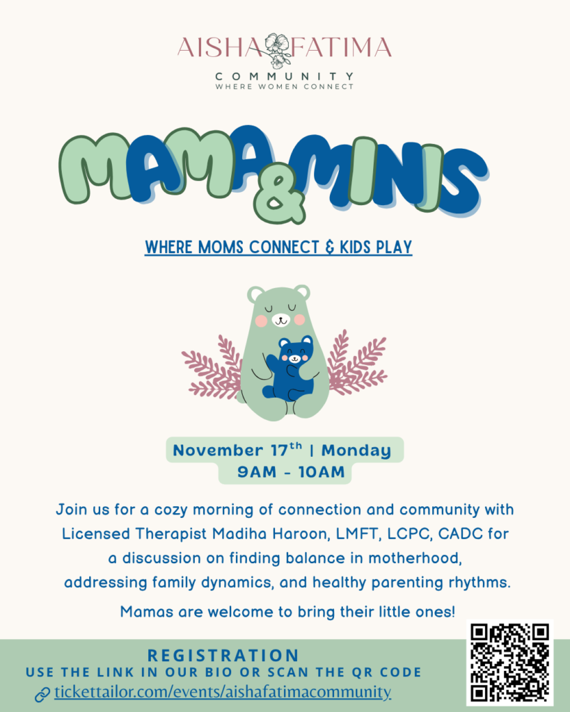 Join us for a cozy morning of connection and community with Licensed Therapist, Madiha Haroon, LMFT, LCPC, CAD! This month, we’re welcoming a licensed therapist to guide an open conversation on finding balance in motherhood — from navigating family dynamics with in-laws and partners to creating healthy rhythms in parenting. Come as you are and leave feeling supported and empowered.