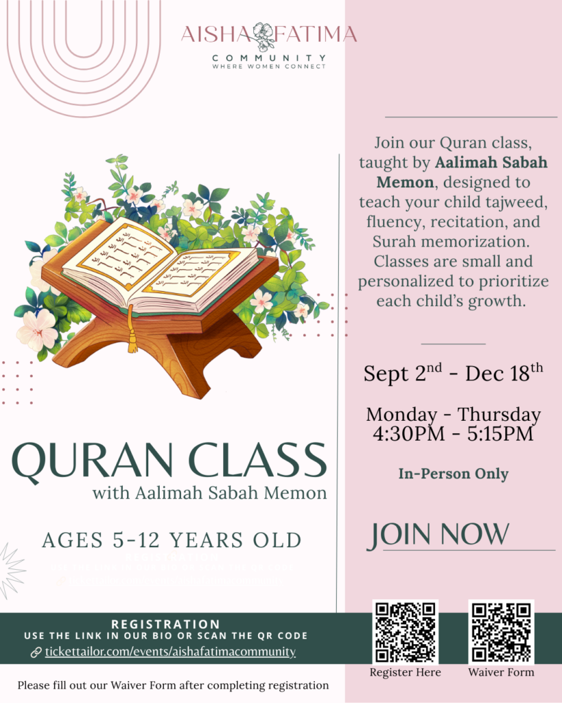 Join our Quran class, taught by Aalimah Sabah Memon, designed to teach your child tajweed, fluency, recitation, and Surah memorization. Classes are small and personalized to prioritize each child’s growth.