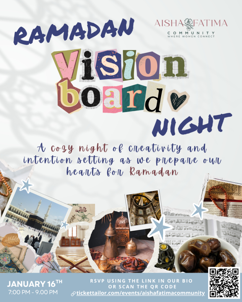 Prepare your heart and mind at a fun and relaxing evening of arts and crafts in preparation of the blessed month of Ramadan. Bring your friends and join us to connect, reflect, and create Ramadan vision boards to set intentions and personal goals to help you make the most of this Ramadan.