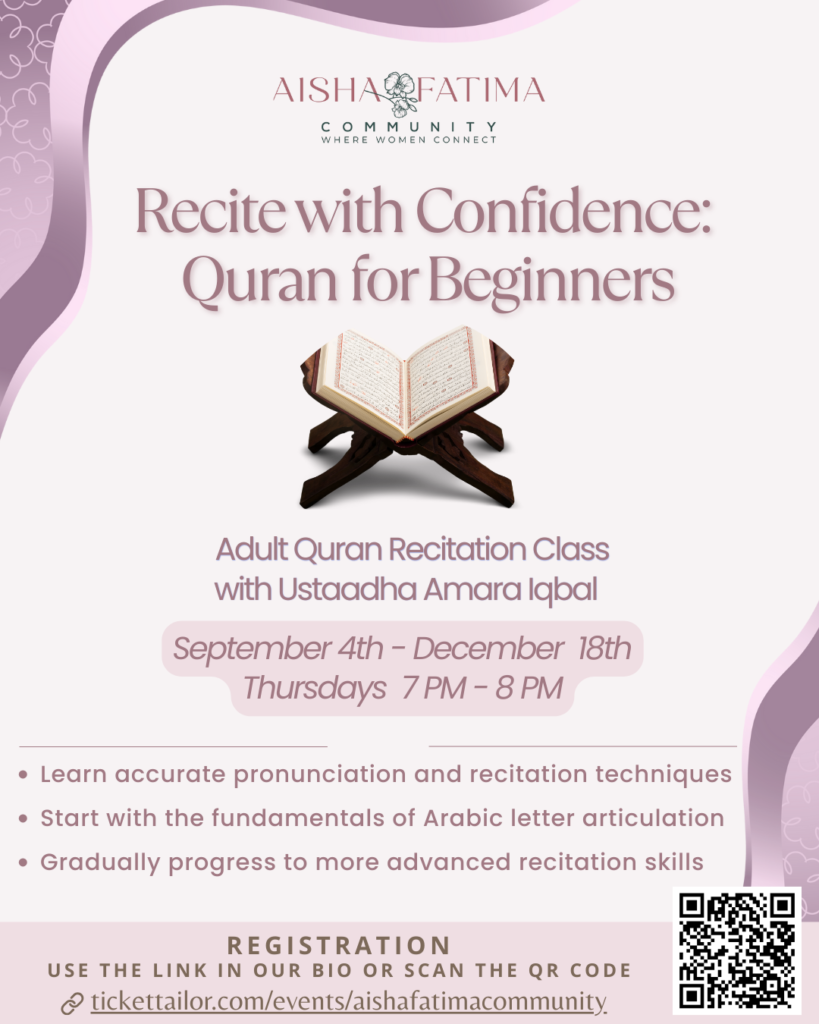 Join our Quranic Recitation class with Ustaadha Ammara Iqbal to learn accurate pronunciation and recitation techniques. Starting with the fundamentals of Arabic letter articulation, progressing gradually to more advanced topics. By the end of this class, students will develop the skills and confidence to recite the Quran with precision and accuracy.