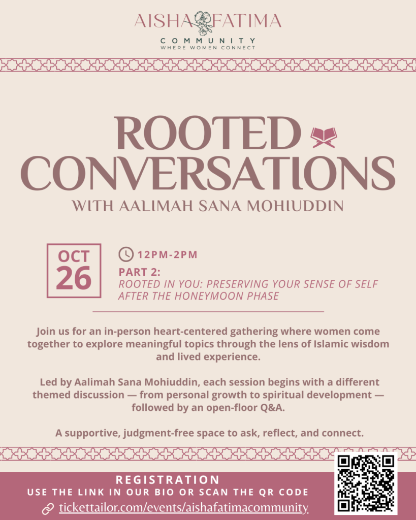 This is your space to ask, reflect, and connect in a supportive, judgment-free environment. Whether you’re seeking clarity, comfort, or simply community, Rooted Conversations with Aalimah Sana Mohiuddin invites you to show up just as you are.