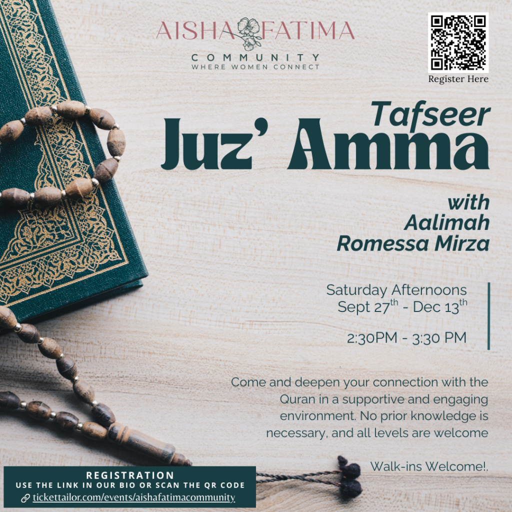 Join us for an in-depth Tafseer (exegesis) of Juz ‘Amma, the 30th and final Juz of the Quran. Led by Aalimah Romessa Mirza, offers women aged 17 and above a unique opportunity to explore the profound meanings and lessons within the short yet powerful surahs that make up this Juz. The Tafseer sessions will focus on understanding the themes, context, and practical applications of these surahs in our daily lives.